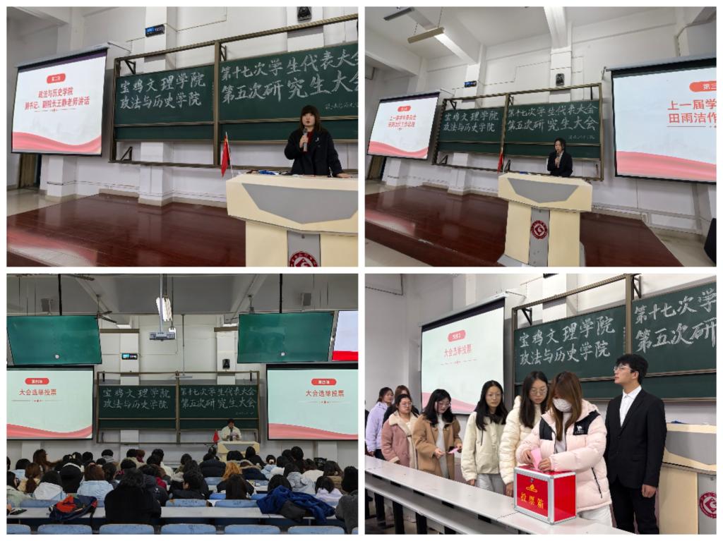 大会审议通过了上届学生委员会代表田雨洁作的工作报告。团委书记何婷妹宣读了《宝鸡文理学院政法与历史学院第十七次学生代表大会暨第五次研究生大会代表选举办法》。与会代表严格按照选举程序,以无记名投票方式选举产生了新一届学生委员会委员、主席团成员以及出席校级学代会和研代会的正式代表。