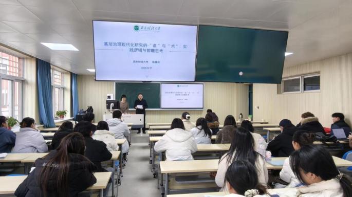 12月17日下午,全国模范教师、陕西省政治学会副会长、西安财经大学陈晓莉教授应邀莅临我校,在高新校区思贤楼125教室,为政法与历史学院师生作了题为《基层治理现代化研究的“道”与“术”:实践逻辑与前瞻思考》的学术报告。本次报告会由政史学院思政系主任陈宇秦副教授主持,2024级、2025级硕士研究生及部分教师50多人参会。